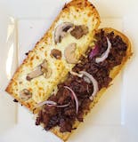 Steak, Italian sausage, onions, banana peppers, garlic butter, pizza sauce and cheese.